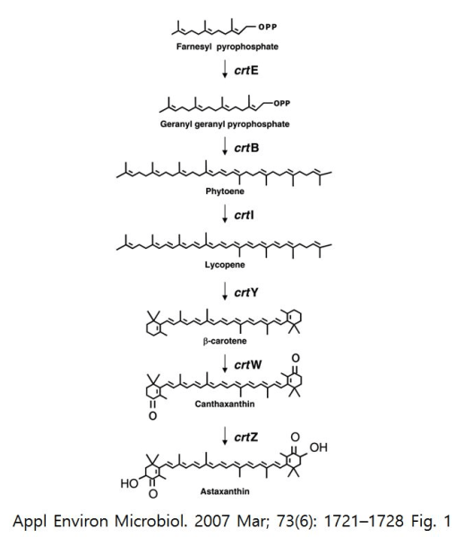 카로티노이드 생합성 경로 (Appl Environ Microbiol. 2007 Mar; 73(6): 1721–1728.)