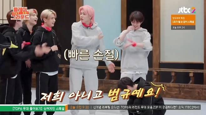 범규는 이후 라운드에서도 똑같은 방법의 꼼수를 썼고 같은 팀인 연준조차 "그만해"라고 소리쳐 웃음을 자아냈다. (사진=JTBC '플레이그라운드' 캡처)