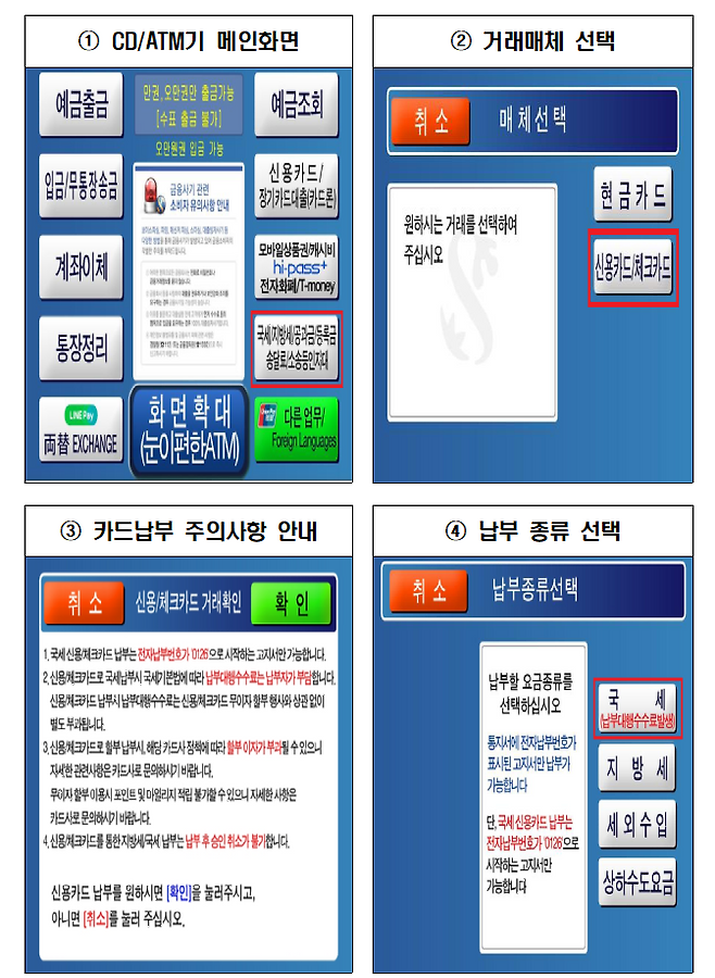 은행 CD/ATM기 마다 화면구성이 조금씩 다를 수 있으며 메인 화면에 국세가 안 보이는 경우 공과금으로 들어가면 됩니다.