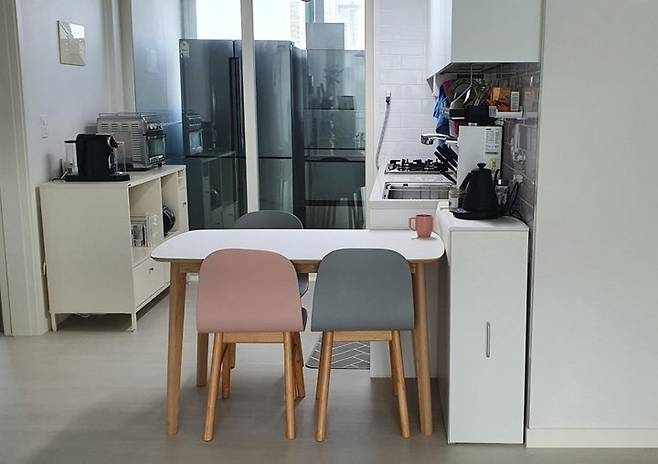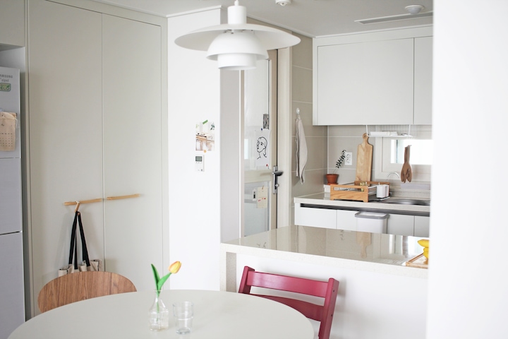 우리 집은 주방이 좁은 편이다. 원래는 아일랜드 식탁이 있었는데, 아일랜드 식탁이 사실 실생활에 자주 쓰이지 않아서 없애버리고 아예 좁은 싱크대를 만든 다음 작은 식탁을 뒀다.