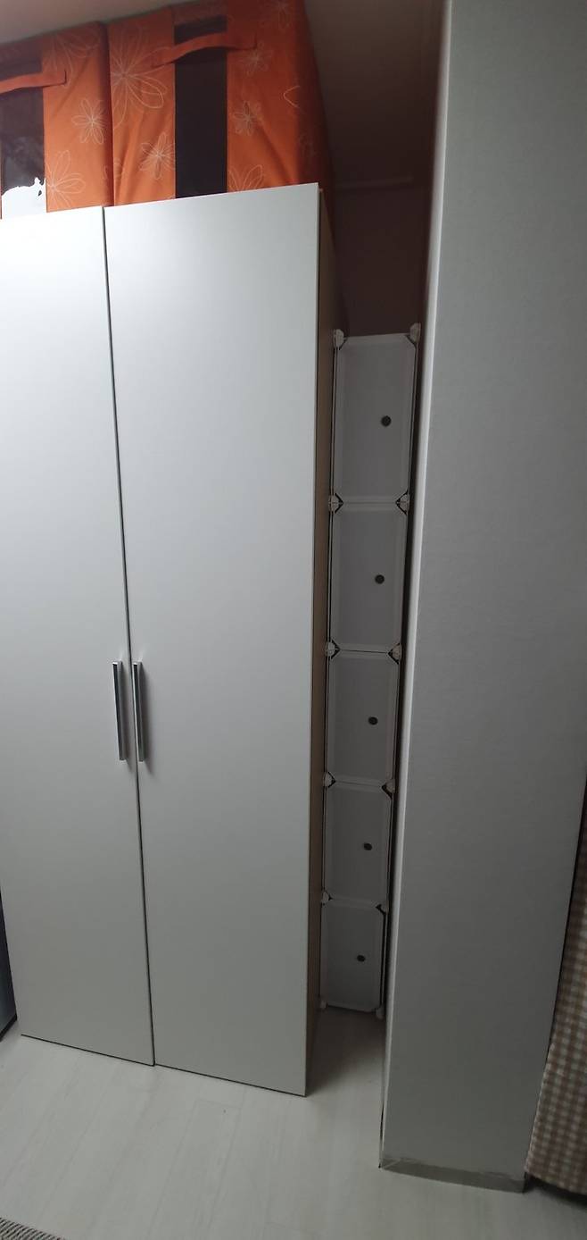 수납장 위에는 옷방에서 사용하던 미니 압축 봉을 여기에 가져와서 부피가 큰 옷걸이를 걸었다. 안방 틈새 수납장은 문이 잘 안 닫혀서 아쉽긴 하지만, 이불 정리가 깔끔하게 되어 다행이었다.