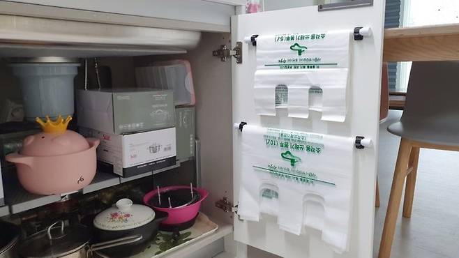 신혼집에 들어와서 처음에는 쓰레기봉투를 접어서 서랍 구석에 보관해두고 있다가, 최근 접는 게 너무나도 귀찮아서 싱크대 하부장 문에 걸어버렸다.