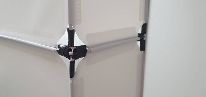설치는 매우 매우 쉽다. 하지만 저게 둘러싼 거 흰 것이 플라스틱이라 생각하면 오산이다. 빳빳한 비닐하우스 비닐 st. 그래서 무거운 건 올려둘 수 없고, 8kg 이하의 가벼운 것만 담을 수 있다. 뭐, 괜찮다. 어차피 나는 가방만 수납할 거라 비닐이어도 상관없음!
