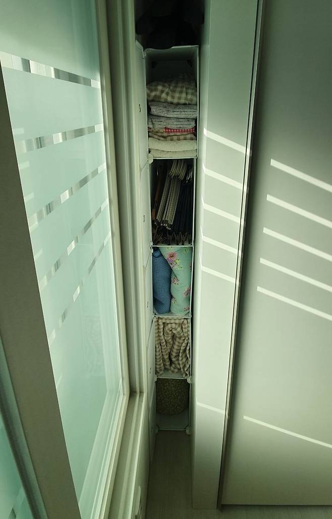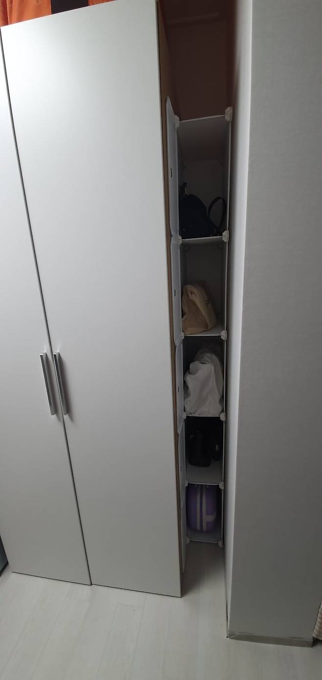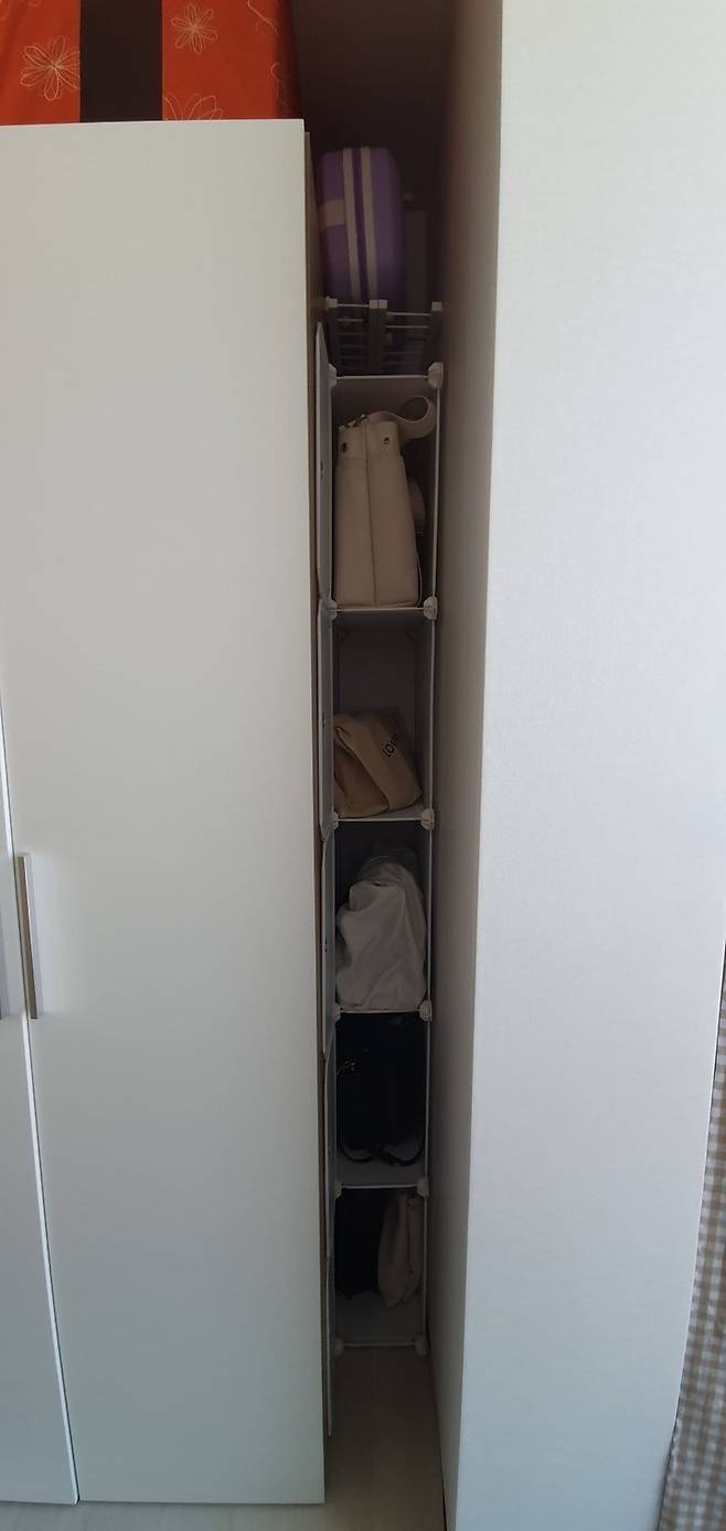 그래서 문이 있는 옷장 옆에 생긴 틈새에 미니 압축 봉과 미니 압축 선반을 끼워 가방을 보관했다.