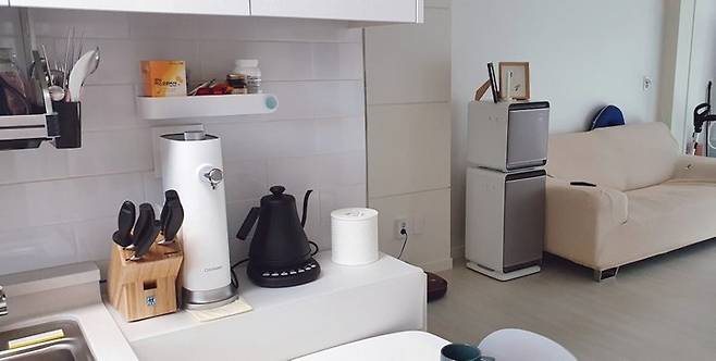 서랍 위에는 칼, 직수기, 전기 포트, 휴지를 올려두면 딱 맞다. 일반 싱크대 높이와도 맞아서 마치 맞춤 가구인 듯한 느낌을 준다.