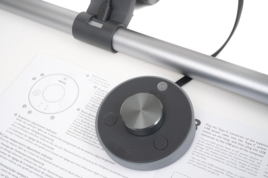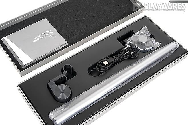 BenQ LED 아이케어 e리딩 플러스 스크린바는 재료 안정성 인증 알류미늄 합금과 폴리카보네이트 소재가 사용되었고, 사이즈는 본체에 해당하는 램프가 45x9x9.2cm(무게 0.68kg) 사이즈, USB 전원 케이블이 마련된 다이얼은 7.4x7.4x3.3cm 크기를 갖는다 소개되고 있습니다. 모니터 장착을 위해 클립 액세서리가 함께 제공되고 이를 통해 모니터 장착 시 세부적인 각도 조절이 가능한 구조입니다. 다이얼에는 조도 센서를 포함해, 자동 밝기 기능 버튼, 밝기 단계/색온도 조절용 버튼이 각각 마련되어 있어 제공 기능 모두를 매우 쉽고 빠르게 조작할 수 있는 게 특징입니다.