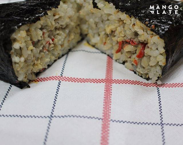참치마요에 꽃맛살을 추가한 맛! 꽃맛살이 중간에만 몰빵 되어있어 한입 먹는다고 맛살이 바로 나오지 않더라구요. 그래도 맛살+마요네즈, 참치+마요네즈는 이미 우리가 아는 맛있는 조합이니까 맛도 무난무난~확 당기는 맛이 없을 때 손이 가는 그런 김밥이에요!