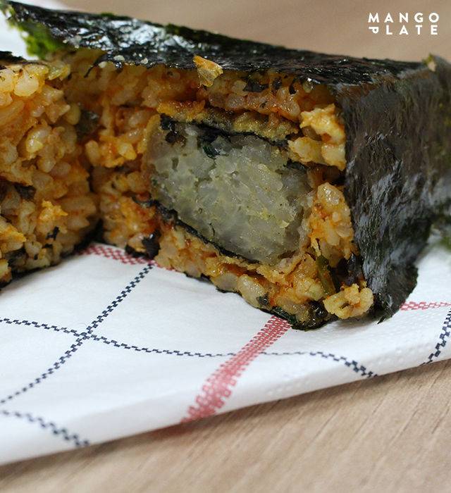 가장 궁금했던 이 삼각김밥...! 두근대는 마음으로 단면을 잘라보았어요! 정말...이름과 한치의 오차도 없이 통째로 김말이가 중앙에 뙇!!!! 맛은 어떠냐구요...? 정말 오랜 시간밖에 놔둬서 눅눅해진 김말이를 케첩 소스에 비벼진 밥과 함께 먹는 것 같아요. 떡볶이 소스에 비벼졌다고 하던데... 난 케첩인 줄..