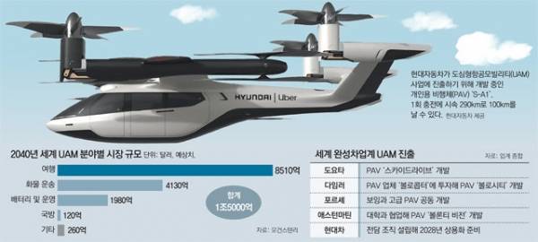 한편, UAM시장은 커지고, 글로벌 업체 간 경쟁이 시작되고 있다. 2년 전 아우디와 에어버스가 파트너십을 맺고 UAM 기체 개발에 나선다고 발표했지만 지지부진하다. 토요타는 스타트업 투자를 통해 비행체를 개발하려는 움직임을 보이고 있다. 세계적인 투자정보 제공기관인 모건스탠리는 다가오는 2040년경 UAM 시장 규모가 1조5000억달러(1700조 원)에 달할 것으로 전망하고 있다.