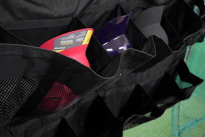 덕아웃 주변에 설치된 그물에 걸어 가지런히 정리할 수 있는 헬맷걸이 가방입니다. 경기 후 헬맷을 분리한 후 편리하게 말아 휴대가 간편합니다.
