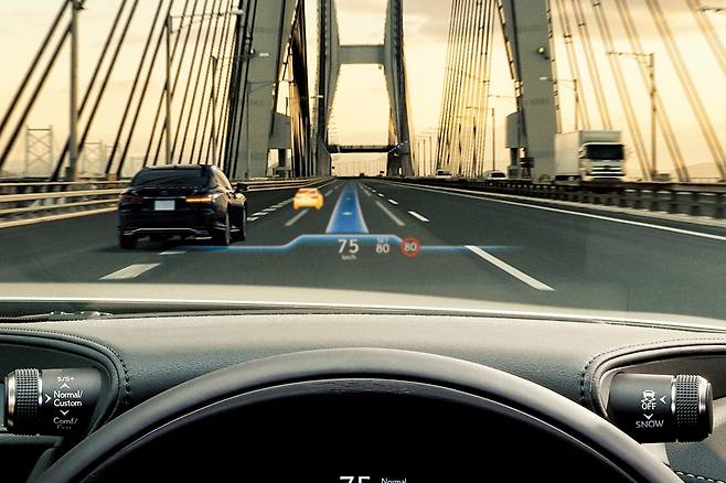 주행 속도 등 자동차의 정보를 계기판이 아니라 앞 유리에 비추는 것이 HUD(헤드 업 디스플레이 )다 . 크루즈 콘트롤을 비롯한 ADAS 시스템이 널리 보급되면서 HUD를 장착하는 자동차들도 많아졌고 , 앞으로는 AR 기술을 적용해 실시간으로 목적지까지의 도로를 보여줄 수 있을 것으로 보인다 . 그러나 이 HUD도 문제가 있는데 , 앞 유리의 구조 상 시인성이 낮아질 수 밖에 없다는 것이다 .