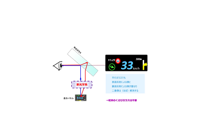 이번에 ‘JVC 켄우드 ’에서 개발한 HUD는 특수 유리 없이도 선명한 이미지를 얻을 수 있다 . 유리 표면의 반사와 후면의 반사를 계산하고 이미지가 투영되는 방향을 최적화해 거의 같은 위치에서 이미지를 볼 수 있도록 만든다 . 이중으로 보이는 문제를 완벽히 해결하지는 못하지만 , 기존보다는 선명한 화면을 얻을 수 있다 . 눈이 예민하지 않다면 구분할 수 없을 정도로 말이다 .