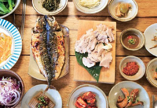 맛깔하게 구운 고등어와 쫀득한 돔베고기를 비롯해 각종 나물과 신선한 쌈 재료들이 한상 푸짐이 차려집니다.