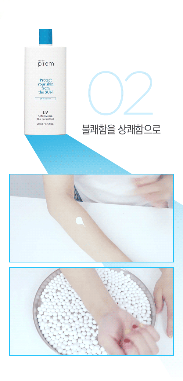 피부 열을 케어하는 식물성 성분을 함유해 피부 온도를 감소시키고 열에 의한 노화를 케어하는 전성분 EWG 그린 등급의 무기 자외선 차단제 ✔메이크프렘 유브이 디펜스 미 블루 레이 선 플루이드 200ml 28,000원.