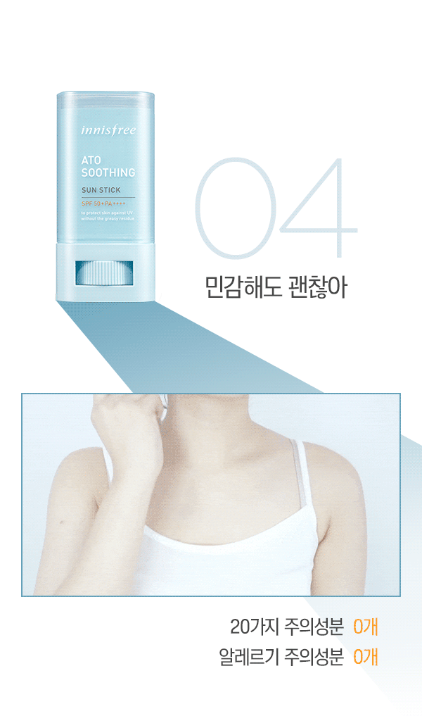 수분 진정에 뛰어난 제주 석창포 성분과 피부에 부담을 적게 주는 무기자차 성분을 100% 함유해, 피부 진정과 선 케어를 동시에 할 수 있는 ✔이니스프리 아토 수딩 선 스틱 20g 20,000원.