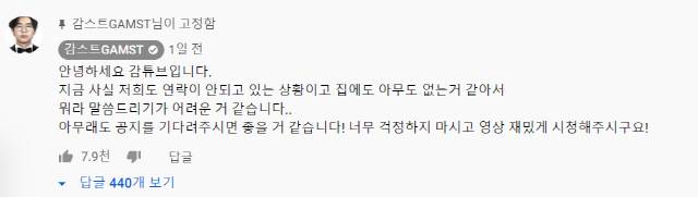 이에 팬들은 감스트가 실종된 것아니냐는 의구심을 나타냈고 채널 측의 댓글로 인해 궁금증은 더욱 증폭됐다.