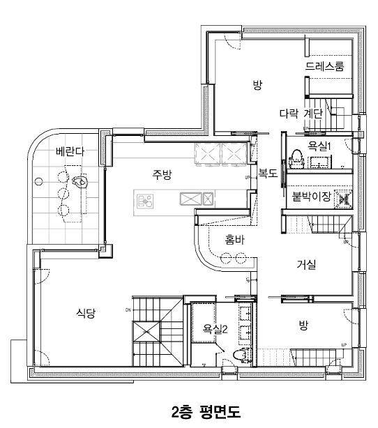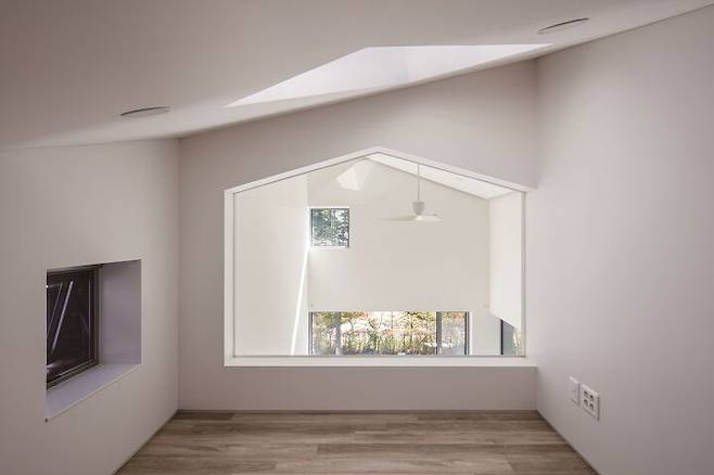 건축주의 공간은 1층에 독립적으로 구성된 현관과 계단을 지나 2층에 펼쳐진다. 공원으로 열리고 천장이 높은 거실과 주방이 펼쳐지고 그 뒤로 침실이 놓여진다. 2층은 건축주가 초기부터 요청한 파티플레이스 겸 북 카페 같은 공간이 되도록 중앙에 주방과 베란다 그리고 책이 있는 놀이공간을 배치해 전체적으로 동선이 순환형으로 연결되도록 구성했다. 그리고 외부공간인 베란다에서 주방과 식당, 세탁실과 욕실이 일직선으로 연결되어 바비큐와 여름 물놀이 등의 공간 사용에 용이하다. 안방과 아이 방은 적당히 거리를 두면서도 각각의 공간에서 다락으로 연결된다.