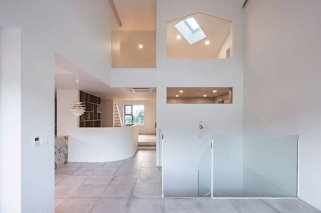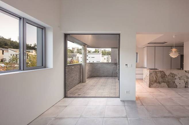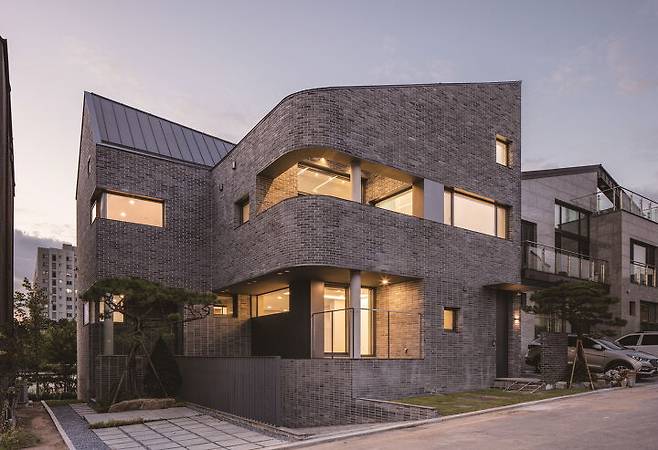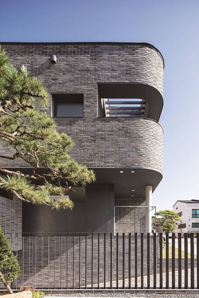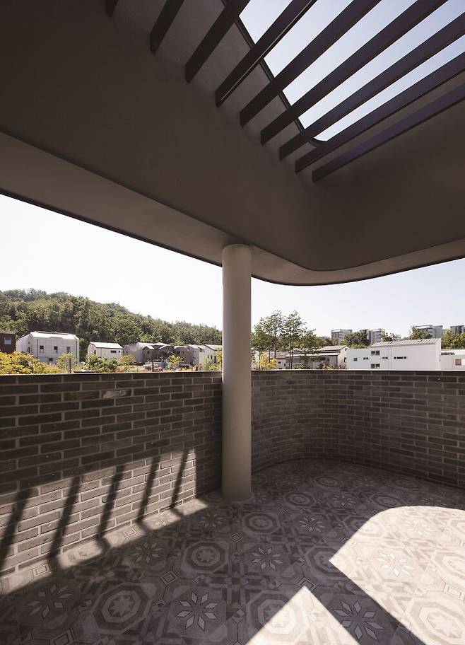 외부는 심플하지만 주변 집들과 다르게 곡선의 요소를 적용해 부드러운 인상을 주고자 했다. 현관과 테라스, 베란다는 집에서 꼭 필요한 실용 공간은 물론이고, 전면부에 깊은 그림자 효과를 주어 입체적인 볼륨감을 강조한다. 이를 통해 자신의 존재감과 개성을 드러내고 동시에 주변 도시와 자연스럽게 호흡이 가능하다. 깊은 공간감 덕분에 외부에서는 무게감을 덜어내고 테라스 안쪽에서 보이는 외부 풍경은 집의 테두리에 담겨 마치 액자 속 사진과 같은 장면이 만들어진다.