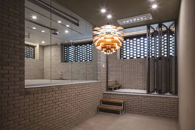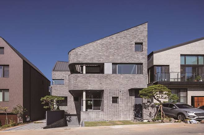 외벽 재료로 선정한 청고벽돌은 한쪽 면을 컷팅해서 고벽돌 특유의 빈티지함 대신 모던하면서 정갈하고 균일한 느낌을 준다. 벽돌은 1층과 2층의 쌓기 방식을 달리해서 보행자 레벨에서 변화를 주었다. 이를 통해 평범해 보이지 않도록 하고 동시에 저층부가 좀 더 단단해 보이는 효과를 가진다.