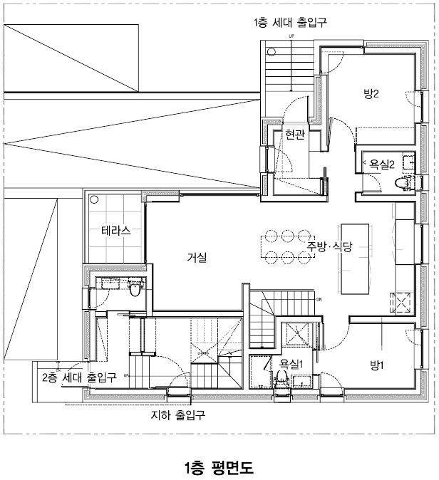 지하 주차장을 만들면서 들어 올려진 1층 별도 세대의 공간은 먼저 출입문을 건축주인 주인세대와 분리해 사생활을 보호하는데 주력했다. 남측에 테라스와 면한 거실과 주방을 두고, 좌우로 방을 배치했다. 그 덕에 공간 분리가 가능한 지하는 더욱 다양하게 활용할 수 있는 공간이 됐다. 최근 변하는 라이프스타일에 맞게 공간을 만들어 좁아 보이지 않고 수납공간 등을 확충하여 실용적인 공간이 되도록 하였다.