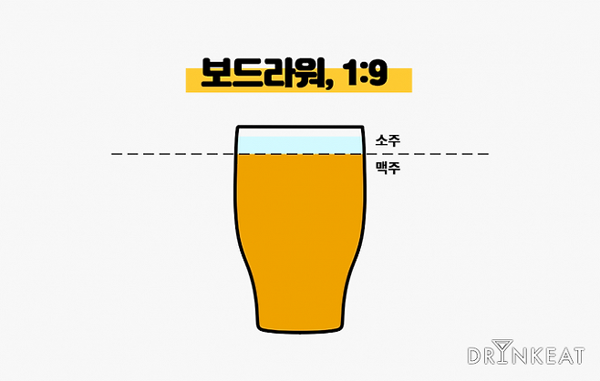 소맥이 처음이거나, 경험이 별로 없는 사람들의 첫 스텝으로 좋은 비율. 맥주잔에 소주와 맥주를 1:9 비율로 섞어 주세요. 소맥보다는 맥주에 가까운 비율이지만, 맥주만 마셨을 때보다 맛과 목넘김이 부드럽답니다.