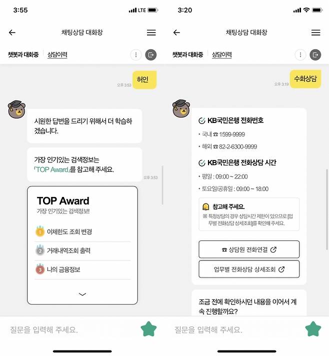 국민은행 관계자는 “학습한 툴을 벗어난 질문이면 답하기 어려울 수 있다”라며 “일상대화는 학습 단계라 고객이 원하는 수준은 아니다”고 답했다. 이어 “금융 상담과 일상대화 모두 자체 데이터베이스 업데이트로 상담능력을 고도화하고 있다”고 덧붙였다.
