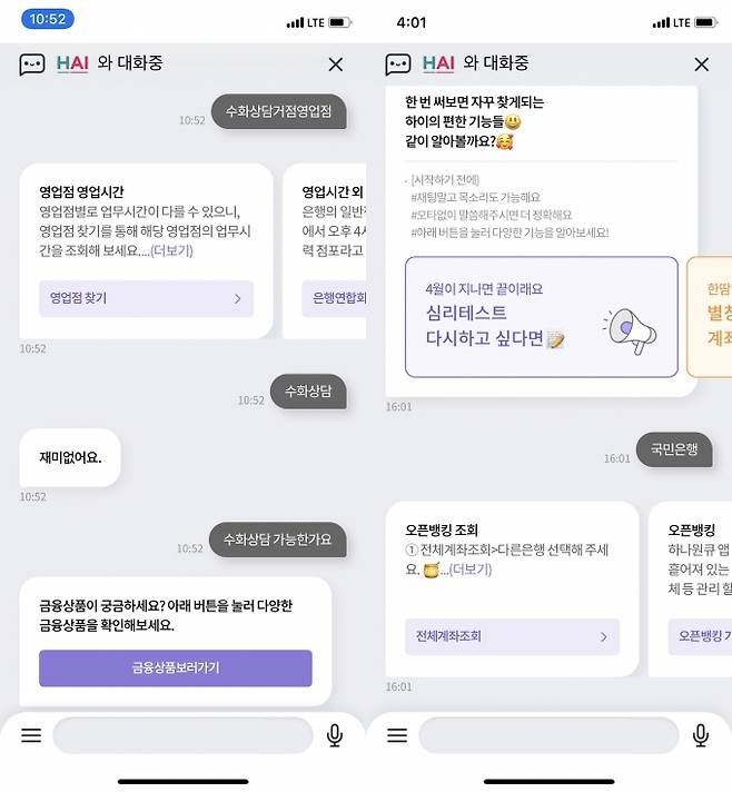 [쿠키뉴스] 송금종 기자 = 최근 은행 AI(인공지능) 챗봇은 창구 직원 그 이상이다. 금융 상담은 물론 소소한 재미를 주기도 한다. 요즘은 챗봇으로 심리테스트도 할 수 있다.