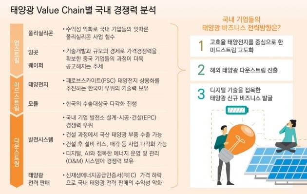 국내 태양광 기업들은 태양전지, 모듈 등 부품 생산기업을 넘어 재생에너지 토탈 솔루션 기업으로 나아가기 위해 해외 태양광 발전소 EPC(설계·조달·시공) 비즈니스를 적극 추진 중이다. 보고서는 해외 시장이 원가가 상대적으로 적게 들고, 전력 판매가 자유화돼 있어 국내 기업들이 해외 태양광 다운스트림 비즈니스에 주목하고 있다고 전했다. 미국 워싱턴주, 독일 등과 같이 전력 시장이 자유화된 곳에선 소비자가 직접 발전사업자를 선택할 수 있고 태양광 발전사업자들이 다양한 요금제를 개발할 수 있다.