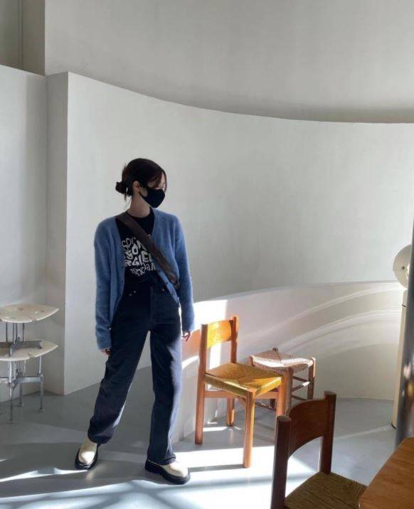 티셔츠 위에 파스텔 블루 컬러의 가디건을 걸쳤는데요.