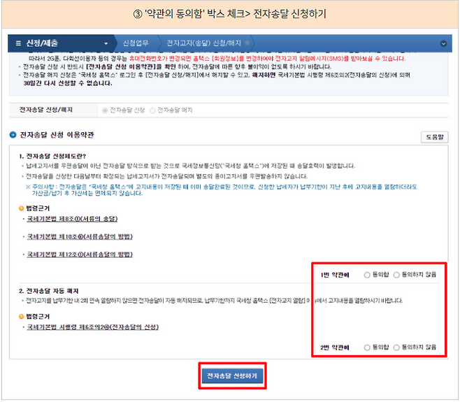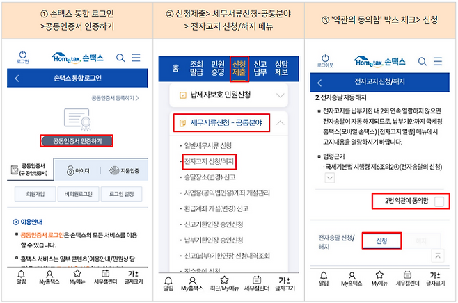 전자신고 서비스 확대로 국세 고지서를 등기우편이 아닌 모바일로 받아볼 수 있습니다. 모바일 고지서를 원하는 경우, PC홈택스나 손택스에서 전자고지를 신청하면 됩니다. 전자고시를 신청하면 홈택스로부터 카카오톡이나 문자를 수신하게 되는데, 문자에 따라 본인인증을 하면 전자고지를 열람할 수 있습니다.