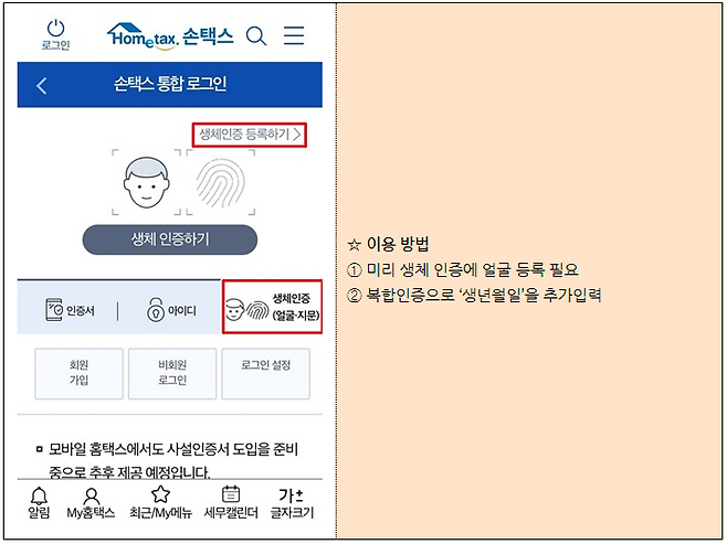 iOS(아이폰) 사용자가 손택스를 쉽고 안전하게 이용할 수 있도록 페이스 ID를 도입했습니다. 이는 2017년 11월 이후 출시한 아이폰에서만 이용이 가능하고, 향후에는 안드로이드 기기에도 적용할 계획입니다.