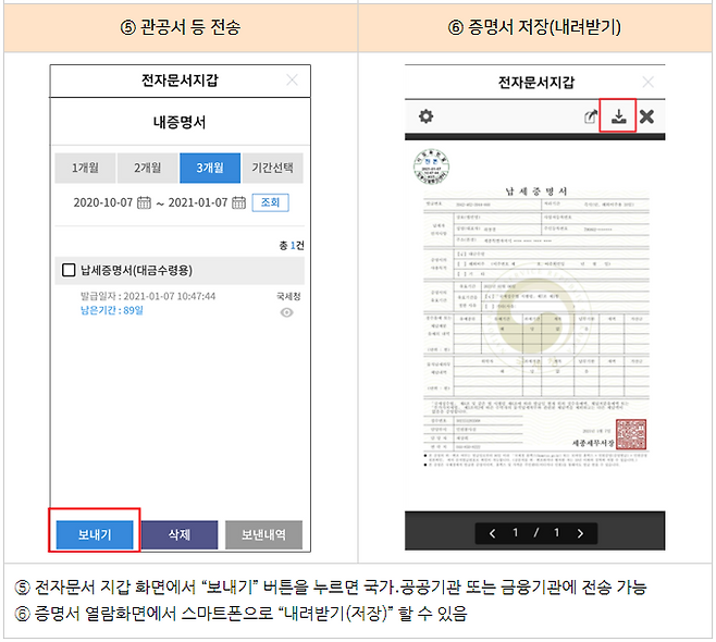손택스를 통해 발급 받은 국세증명서는 전자문서지갑을 이용해 스마트폰에 저장하거나 관공서·은행 등에 바로 전송할 수 있습니다.