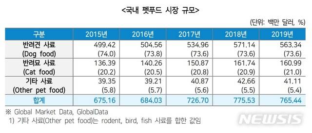 유로모니터 자료에 따르면 2020년 국내 펫푸드 시장 규모는 약 1조2650억원(건식사료, 습식사료, 간식 포함)에 이를 것으로 전망된다. 반려견 사료 시장 규모는 약 7923억원, 반려묘 사료 시장 규모는 약 4728억원으로 추정된다.