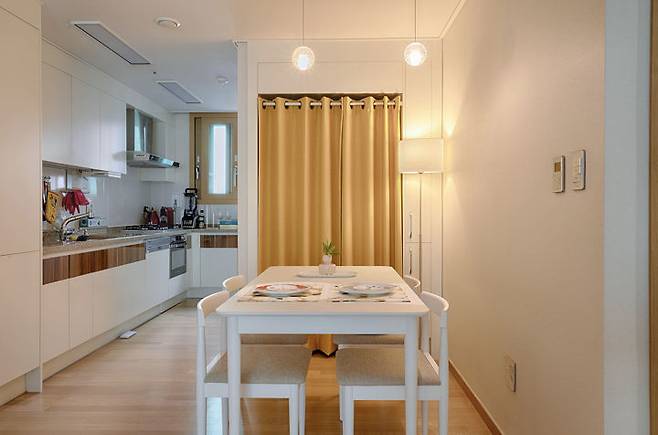 조명의 노란 빛과 어우러지는 공간.