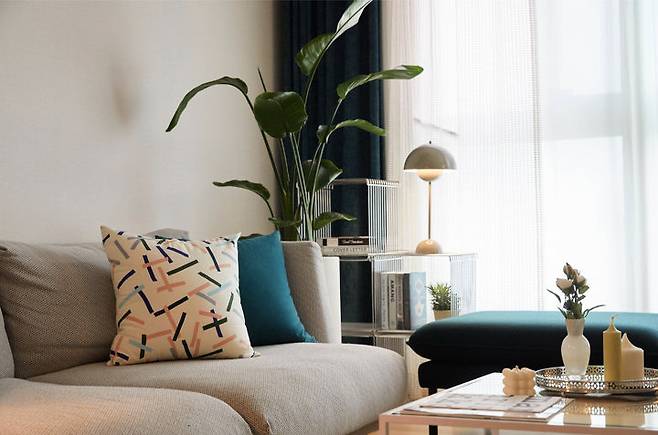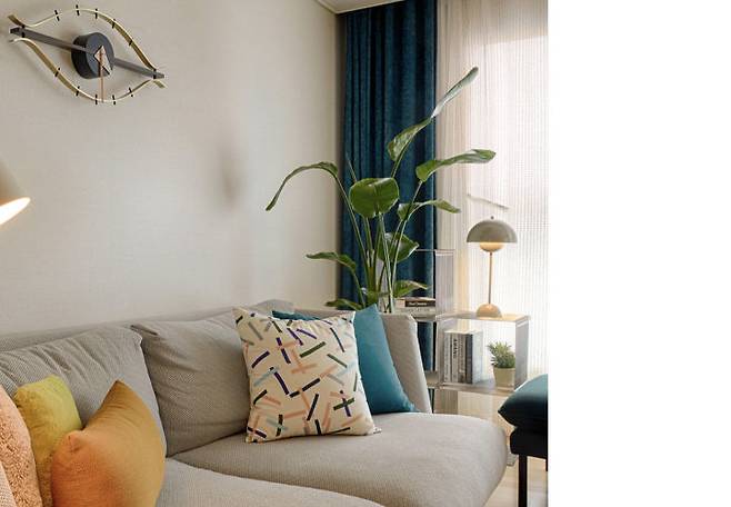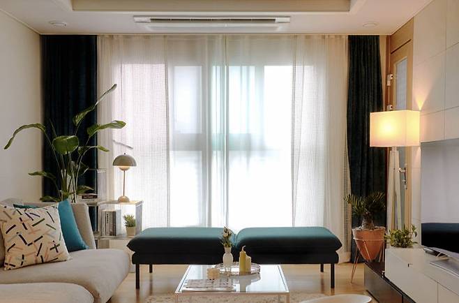 첫번째로 소개해 드릴 공간은 거실입니다. 처음 미팅 때문에 집을 찾아왔을 때, 청록색 벤치 스툴과 식물이 눈에 띄었어요. 창가에 스툴과 비슷한 청록색의 암막 커튼을 달아 주었더니 모던하지만 싱그러운 분위기가 살아났습니다.
