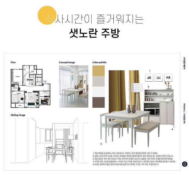 샛노란 포인트가 있는 주방입니다. 팬던트 조명과 스탠드 조명의 노란 불빛과도 잘 어울리면서, 음식을 더 맛있어 보이게 해주는 색이지요. :)