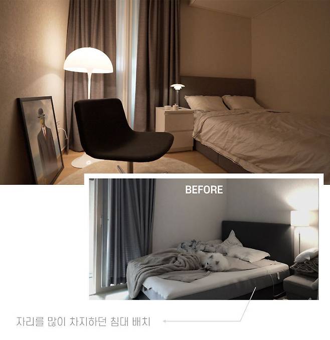기존 침실은 침대 하나로 많은 공간을 낭비하고 있었어요. 침대의 방향을 돌려 한쪽 공간을 더 넓게 사용할 수 있도록 공간을 만들었습니다.