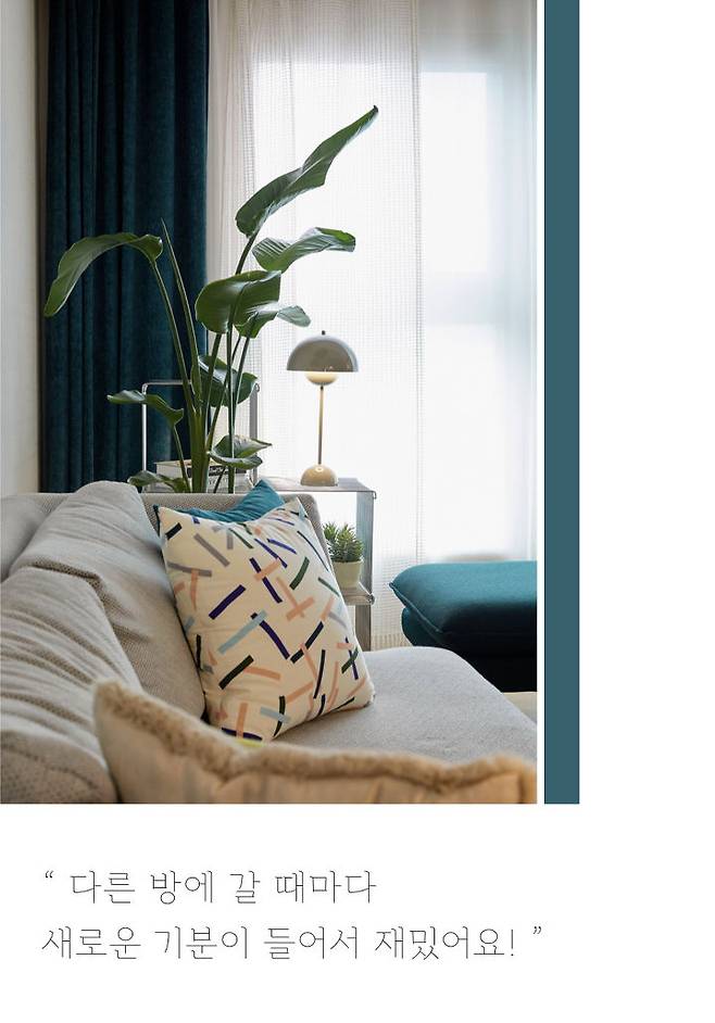 볕이 좋을 땐 속커튼을 내어 부드럽게, 저녁에는 청록색 암막커튼으로 차분하고 진중한 분위기를 만들 수 있어요. :)