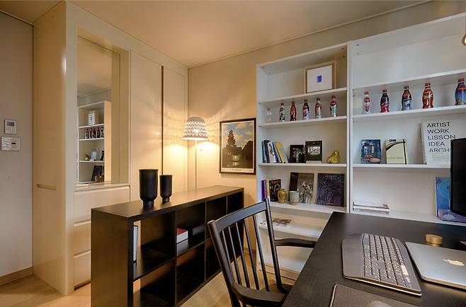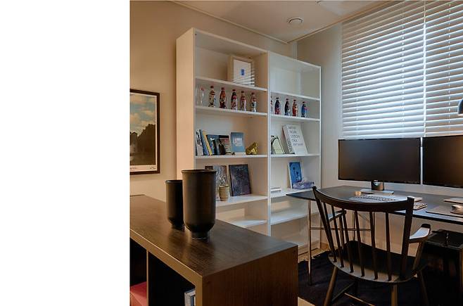 사진 왼편에 보이는 하얀 장은 아파트 기본 옵션으로 기존부터 있었던 붙박이장인데요. 주로 잡동사니를 보관하셔서 업무 공간과 심리적인 분리가 필요할 것 같았어요. 공간이 좁아 보이지 않도록 낮고 오픈된 책장을 선택해서 공간을 분할해 주었습니다.