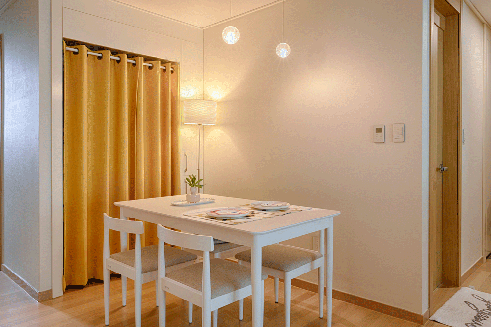 이 공간에는 길이가 꼭 맞는 수납장을 배치해서 비밀 수납 공간을 만들어 드렸습니다. 식탁으로 가려지는 아래 부분은 주방 용품을, 위쪽은 여행 기념품들을 전시하는 용도로 사용하신다고 해요.