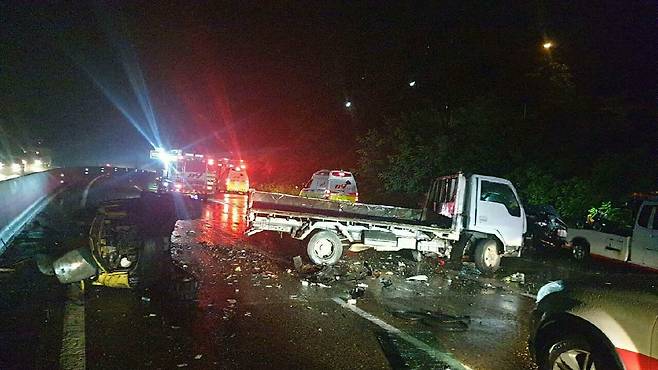 오히려 볼보를 추돌한 40대 트럭 운전사가 다리에 골절상을 입었다. 트럭에 타고 있는 운전자는 중상을 입었는데, 볼보에 타고 있던 사람은 모두 경상을 입은 것이다.