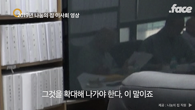 직원들은 이사진이 후원금을 나눔의 집 설립 목적과 다르게 사용하려고 모아왔다고 주장합니다. 실제로 나눔의 집 직원이 제공해준 2019년 이사회 영상을 보면 이사진이 이런 이야기를 합니다.