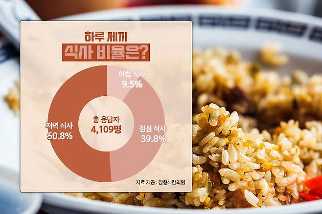 성인 4,000여 명을 대상으로 하루 세끼 식사 비율을 조사한 결과, 저녁을 가장 푸짐하게 먹는 것으로 나타났어요. 무려 절반 이상이 저녁에 더 많이 먹는다고 답했는데요. 아침, 점심, 저녁 식사량을 비율로 나타내면 1:4:5에요. 즉, 아침은 거르거나 간식으로 때우고 저녁 식사는 거하게 먹는다는 말이죠.