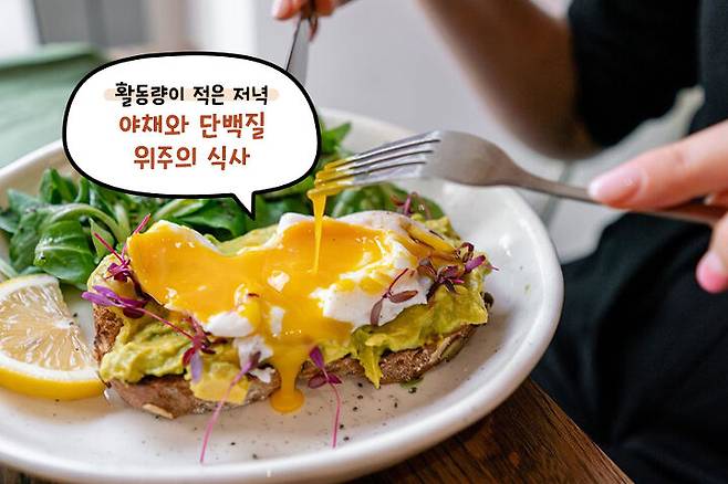 식이섬유가 풍부해 포만감이 오래가고 열량이 낮으며 식이섬유와 비타민 등 영양소를 섭취할 수 있는 채소를 기본으로 저녁 식사를 구성하면 좋아요. 닭 가슴살이나 달걀, 생선 등 단백질이 풍부한 토핑을 얹고, 잡곡이나 오트밀 등 복합 탄수화물 소량 더해주면 금상첨화죠.