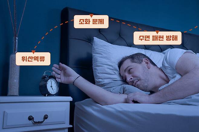 당연한 얘기지만 잠들기 직전 식사를 하거나, 소화가 되지 않을 만큼 많은 양을 먹는 것은 좋지 않습니다. 신체가 제대로 소화할 시간을 주지 않기 때문인데요. 걷거나 서있을 경우 중력의 도움을 받아 소화가 가장 원활히 이뤄져요. 하지만 취침 직전에 식사를 많이 하고 배가 부른 상태로 누우면 소화에 방해가 되고 위산이 역류할 가능성이 높아집니다. 그뿐만 아니라 자는 동안 소화 기관도 쉬어야 하는데 그럴 수가 없어요. 숙면은 물 건너 가고, 피곤한 상태로 아침을 맞이하는 거죠.