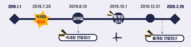 2019년 7월 20일에 국세청을 퇴직한 누리우리가 10월 10일 통계청에 첫 출근을 하게 되었습니다! 그러니까 누리우리는 2019년, 국세청에서 1~7월까지 근로소득 발생, 통계청에서 10~12월까지 근로소득이 발생하게 됩니다.