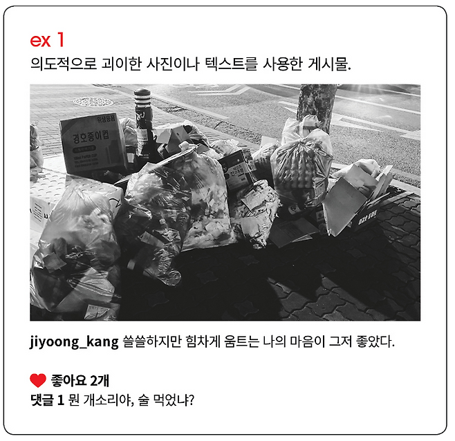 예의상 팔로우는 해놓는데, 이런 애들 피드는 그냥 스킵하게 된다. 가끔 '좋아요' 눌러주면 째지게 좋으면서도 좋은 티는 차마 못 낸다. 이쪽 유형엔 묘하게 자존감 낮은 타입들이 꽤 있다. 재미도 대부분 없어.