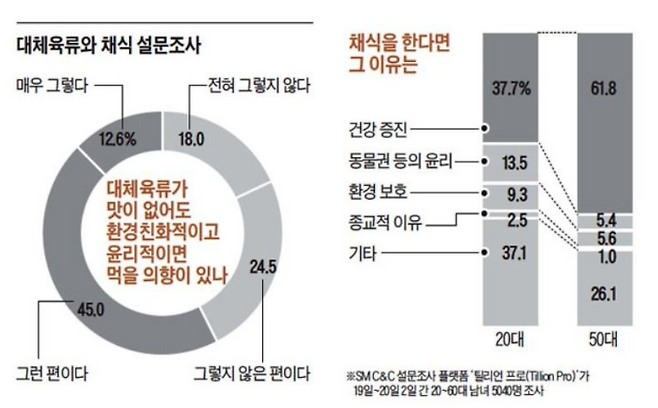 국내에서도 양측의 갈등은 커지고 있다. 채식주의자 모임인 한국채식연합은 채식 인구를 약 100만~150만명(작년 기준)으로 추정하고 있다. 설문조사기관 ‘틸리언 프로(Tillion Pro)’는 20~60대 5040명을 대상으로 채식에 관한 의견을 조사해 7월1일 발표했다. 20대와 30대에서 육식이 비윤리적이라고 생각하는 비율이 높게 나타났다. '육식이 비윤리적이냐'라는 질문에 그렇다고 답한 응답자는 20대(26%), 30대(25.4%), 40대(20.5%), 60대(20.3%), 50대(18.5%) 순으로 많았다. 채식주의자에 대한 반감 또한 20대와 30대가 다른 세대보다 컸다. '채식주의자가 위선이라고 느껴질 때도 있나'는 질문에 '그렇다'고 답한 비율이 20대는 26.6%, 30대는 24.9%였다. 50대(16.7%), 60대(18.9%)보다 훨씬 높았다.