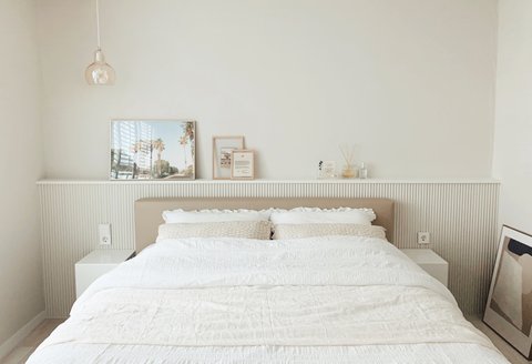 침대쪽은 차분한 아몬드우유 컬러로 도배하고 너무 밋밋하지 않게 침대 헤드쪽에 템바보드를 시공했어요. 템바보드에 어울리는 심플한 느낌과 적당한 헤드 높이의 침대를 찾기가 어려워서 다양한 형태/재질/사이즈로 침대를 제작해주시는 업체를 찾아서 저희가 원하는 느낌으로 주문제작했더니 느낌이 더욱 잘 사는 것 같아요.
