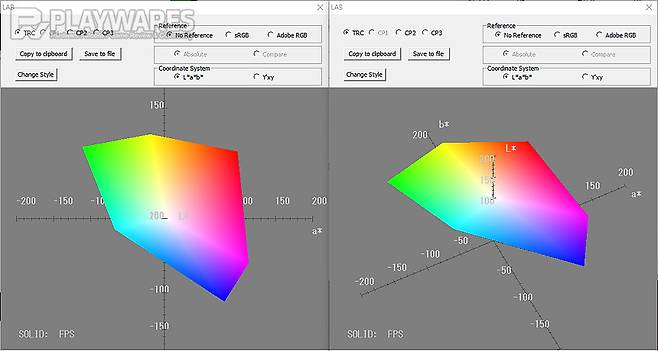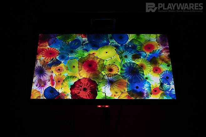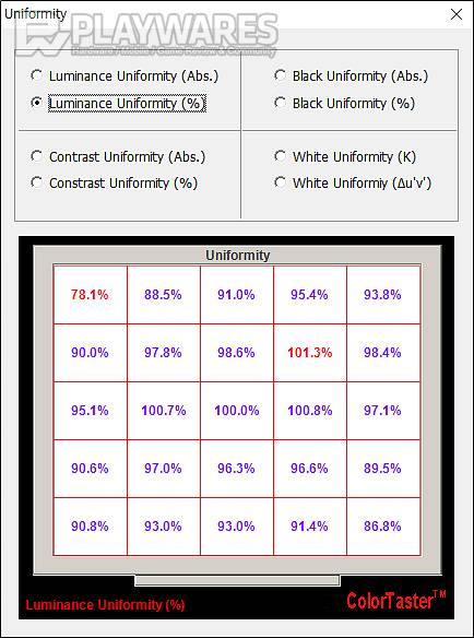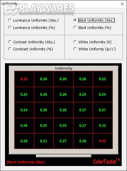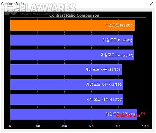 디스플레이는 IPS 액정 방식을 채택한 제품입니다. 0.22-0.42nit 사이의 저휘도 블랙(Black) 색상 표현력을 갖춘 상태에서 명암비는 전용 게임모드 조작에 따라 820:1에서 많게는 940:1에 가까운 수준으로 대비 상태를 나타낼 수 있음이 확인됩니다. 수치상 작은 단위의 차이는 있지만 체감적으론 대부분 게임, 여러 콘텐츠 활용 간 적절한 암부 표현력을 지원받을 수 있는 제품이라 할 수 있겠습니다. 단, 화면의 균일도나 빛샘과 같은 특징은 동일 제품에서도 차이가 발생할 수 있으며, 차트상의 수치는 단일 샘플 제품의 테스트 결과임을 참고해 주시면 되겠습니다.